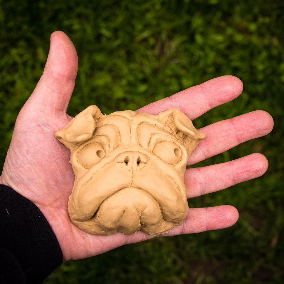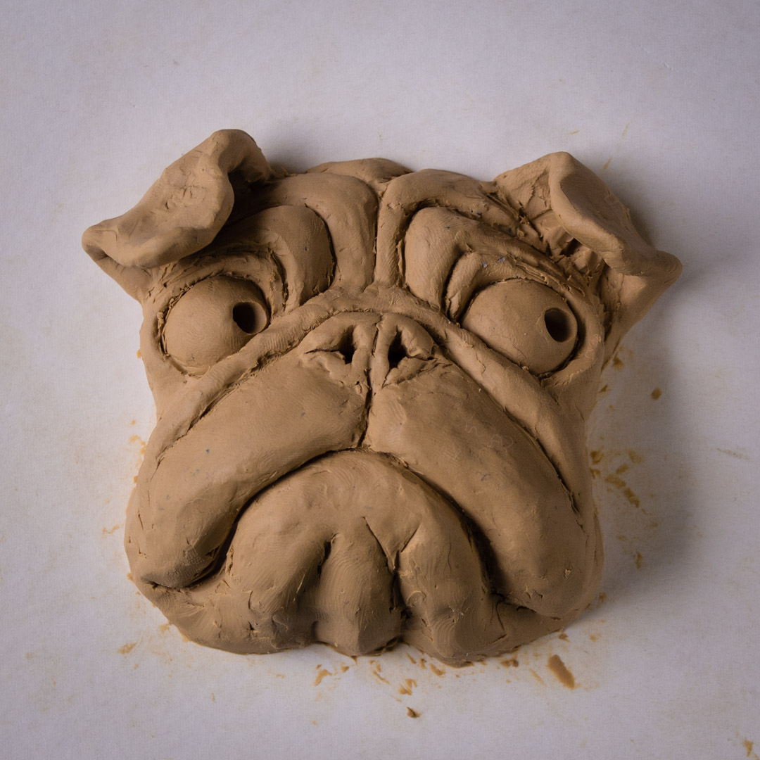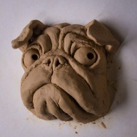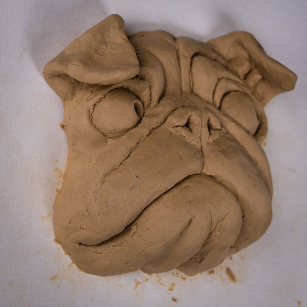 I’m experimenting with smaller sized sculptures. This pug is a mock up for a mold. I’ve yet to do the finish work smoothing out the tool marks because I might make some changes. I also might try casting them in concrete and staining them instead of casting in plaster and painting them. That is why I’ve sculpted the pupil in the eye already. If made out of concrete they could be garden pugs.