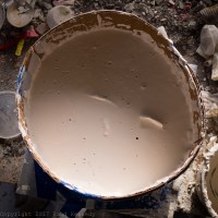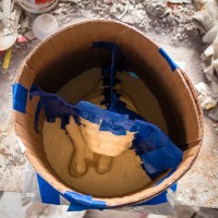 After layering on the liquid latex morning and night, it was time to get the show on the road and cast the plaster cradle that holds the mold in place when filling it with cement. Here’s the process. The blue tape is so the plaster can be removed in sections and then later placed around the rubber mold when casting cement.
