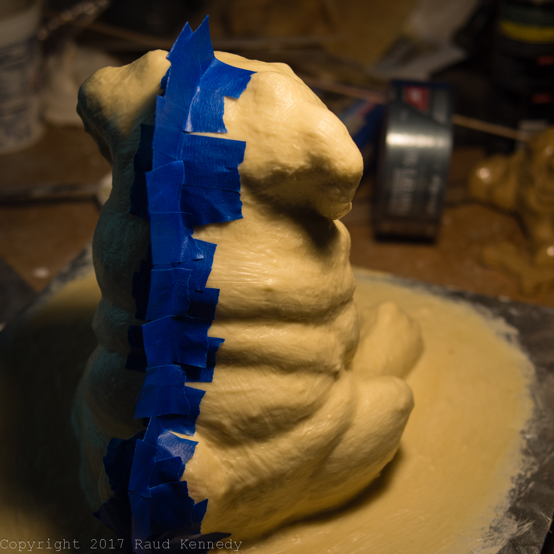 After layering on the liquid latex morning and night, it was time to get the show on the road and cast the plaster cradle that holds the mold in place when filling it with cement. Here’s the process. The blue tape is so the plaster can be removed in sections and then later placed around the rubber mold when casting cement.