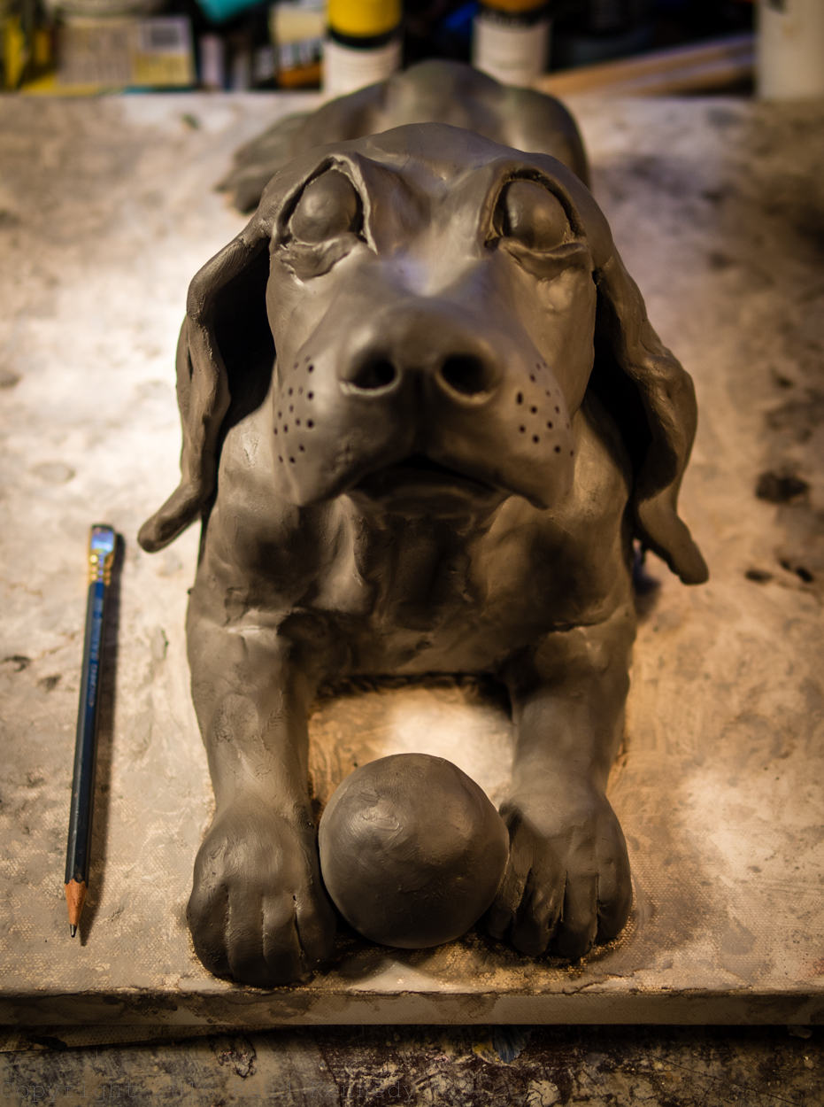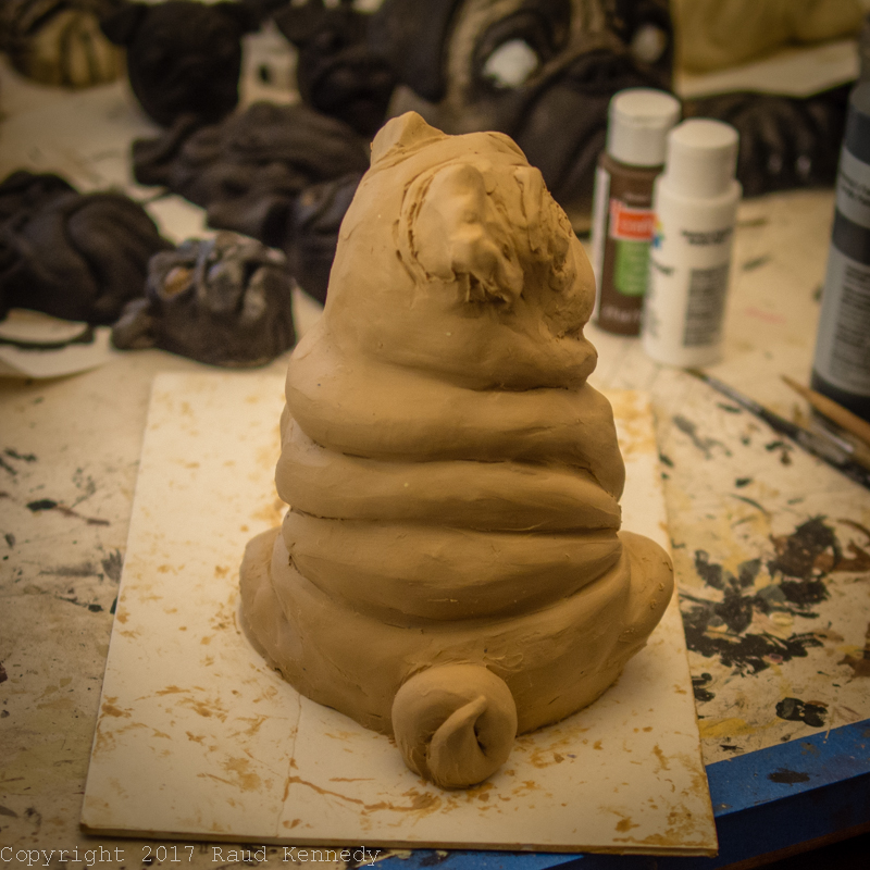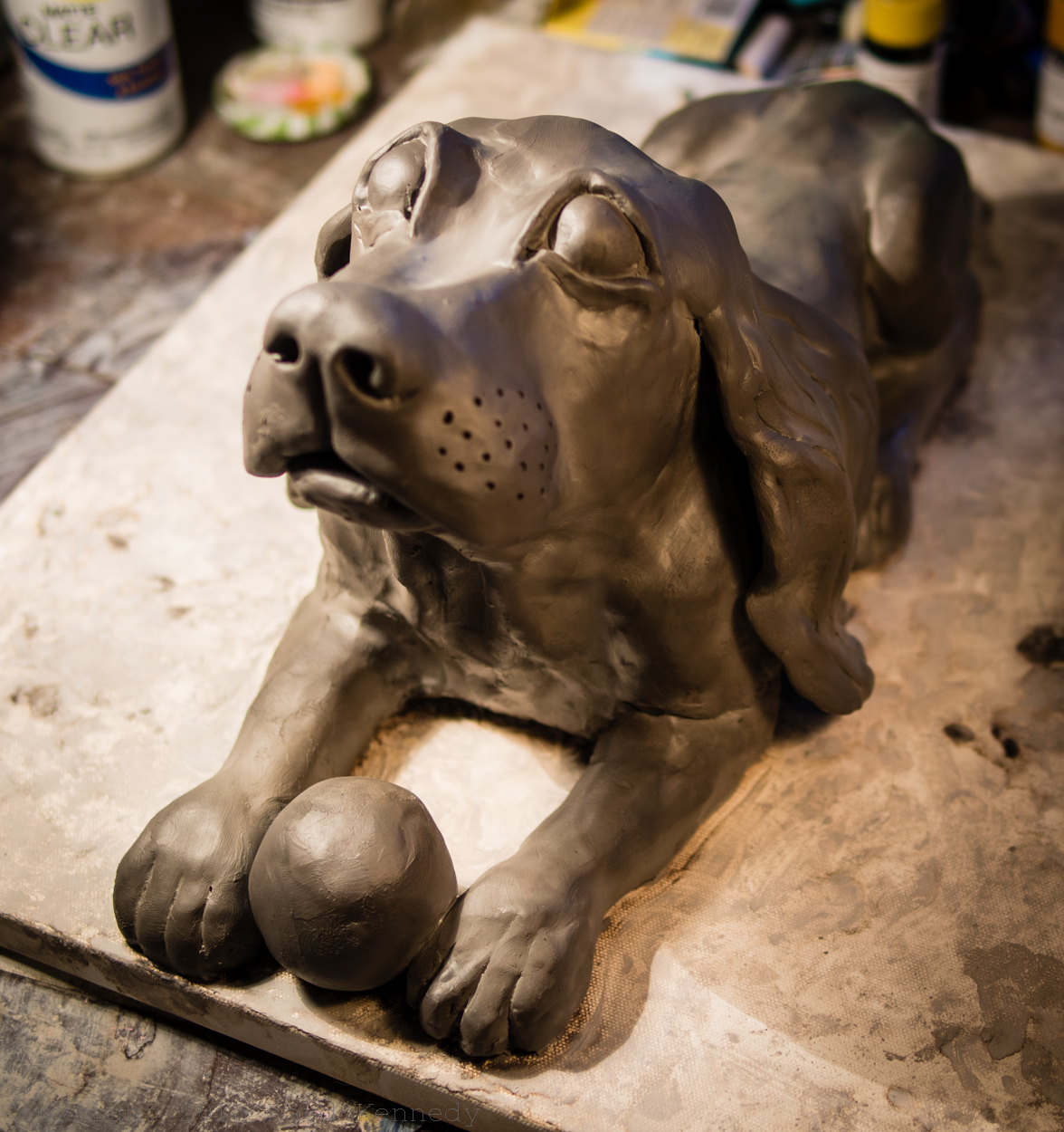 Creating dogs out of clay from photos stresses me out. I’ve procrastinated making this one for at least a month. When I began to think of it as a cartoon in clay, I finally relaxed and was able to make it. It needs to dry a couple days before I turn it upside down and hollow it out. I’ve never done the complete dog, body and all, before. I’ve only done just the head, some for hanging on the wall, others for sitting on a table, some with stands, others for sitting on their own. I did a series of them as candle holders also. Making the entire dog presents its own problems of proportion without letting the size of the dog get out of hand. Next comes painting it. Here are the photos I worked from.