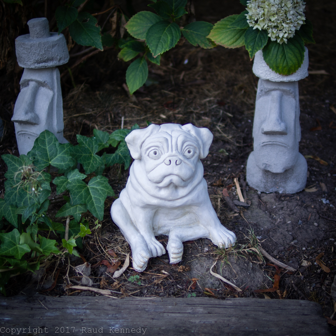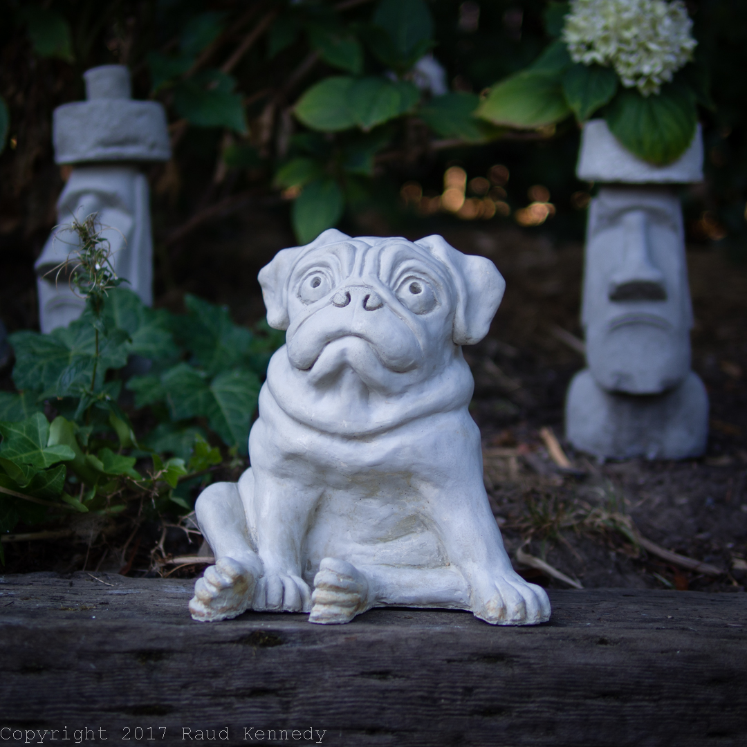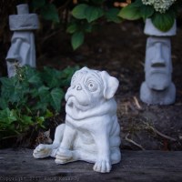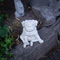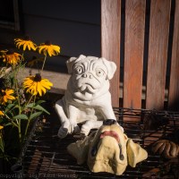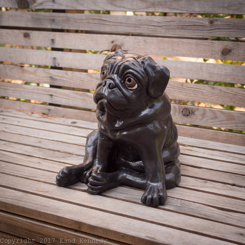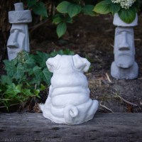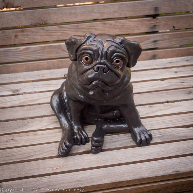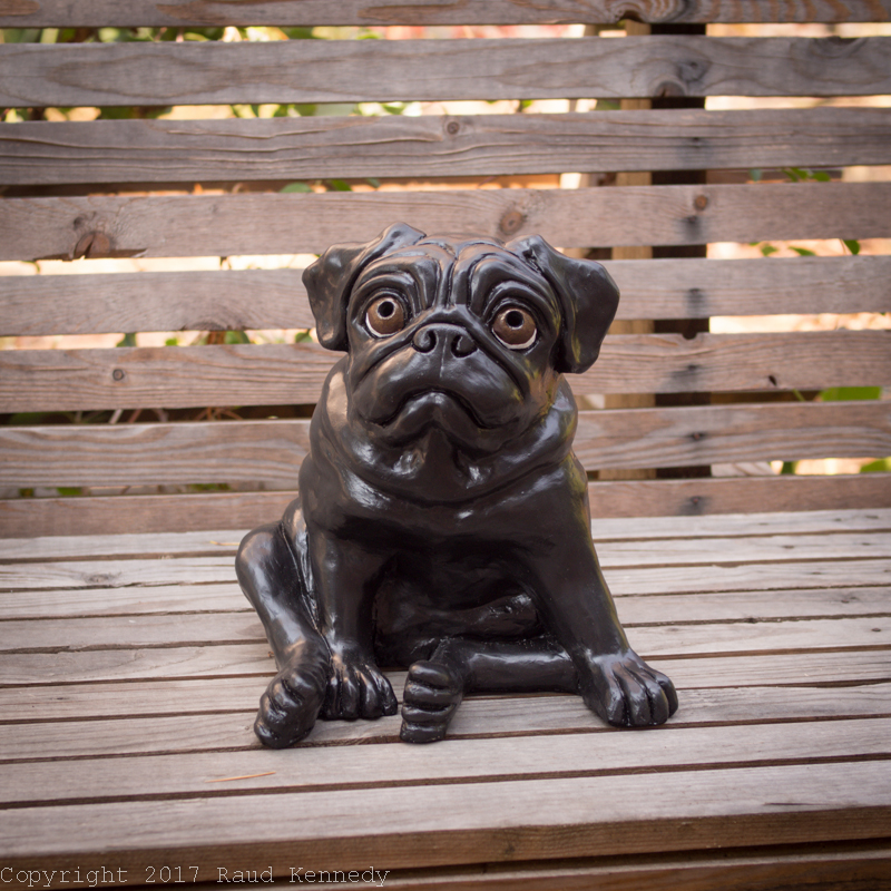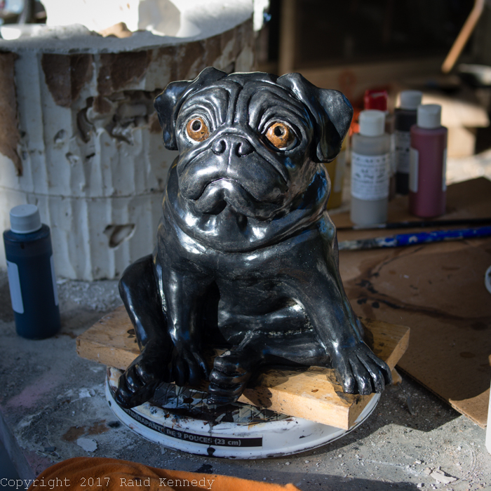 Having just painted one of these using opaque paints, I thought I would try one using the concrete stains which are somewhat translucent depending on how absorbent the cement is. It’s tricky stuff with no do overs. Once the brush touches the cement, that’s where it’s going, and if I have too much stain on the brush it’s prone to run off the brush and go willy-nilly wherever gravity takes it. I get one shot at it. I’m waiting for it to dry before I put the cement sealer on it. The sealer will make the colors richer and shine, but the stain in general gives it an almost glazed effect as if it was fired in a kiln.