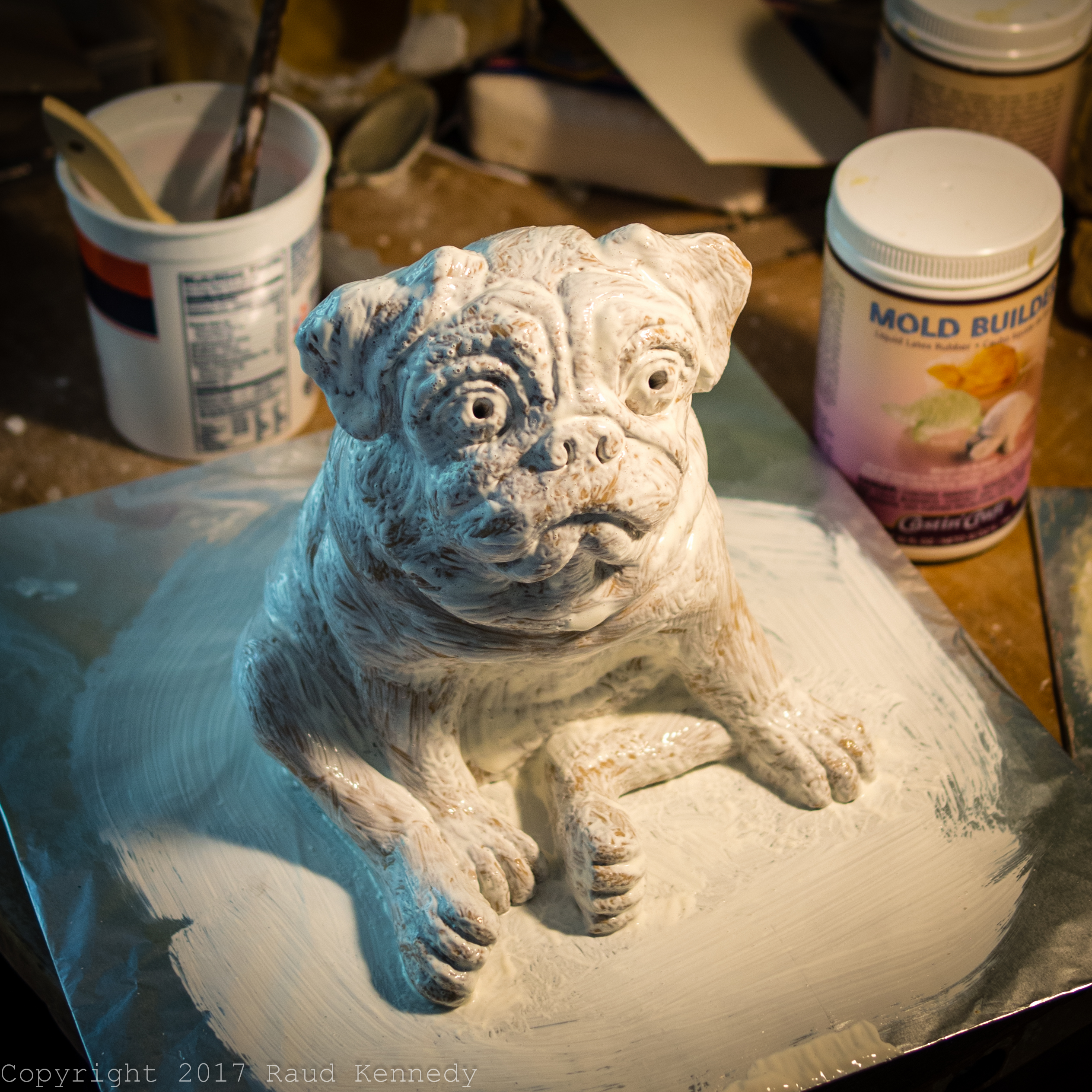 I started the mold making process today. This is the first coat of latex rubber. It takes about 20 coats plus a cellulose thickener. Depending on the temperature I can usually do two coats a day. Then I’ll need to make a cradle to hold the empty rubber mold in place when I use it to make a casting. The cradle for this one is going to be tricky. I’ve used plaster in the past, but this one might have to be part foam. I’ve ten days to figure it out.