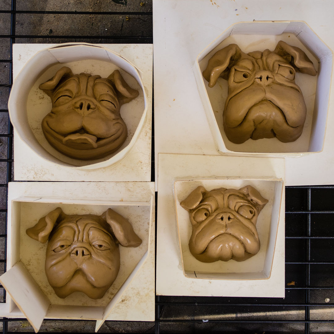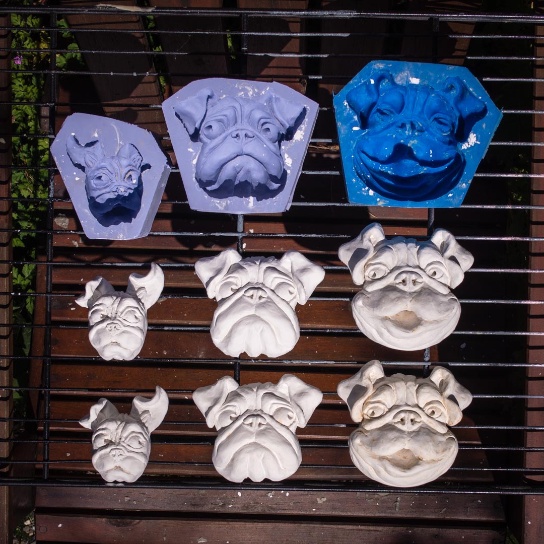 These are hydrostone castings from the new molds I made yesterday to keep as copies in case the molds tear or wear out. The all white material sort of dulls their expressions but you get the gist of them. I filled the molds with concrete this morning and those castings will be ready to show in a few days. The molds turned out really clean with clear details. Yeah!